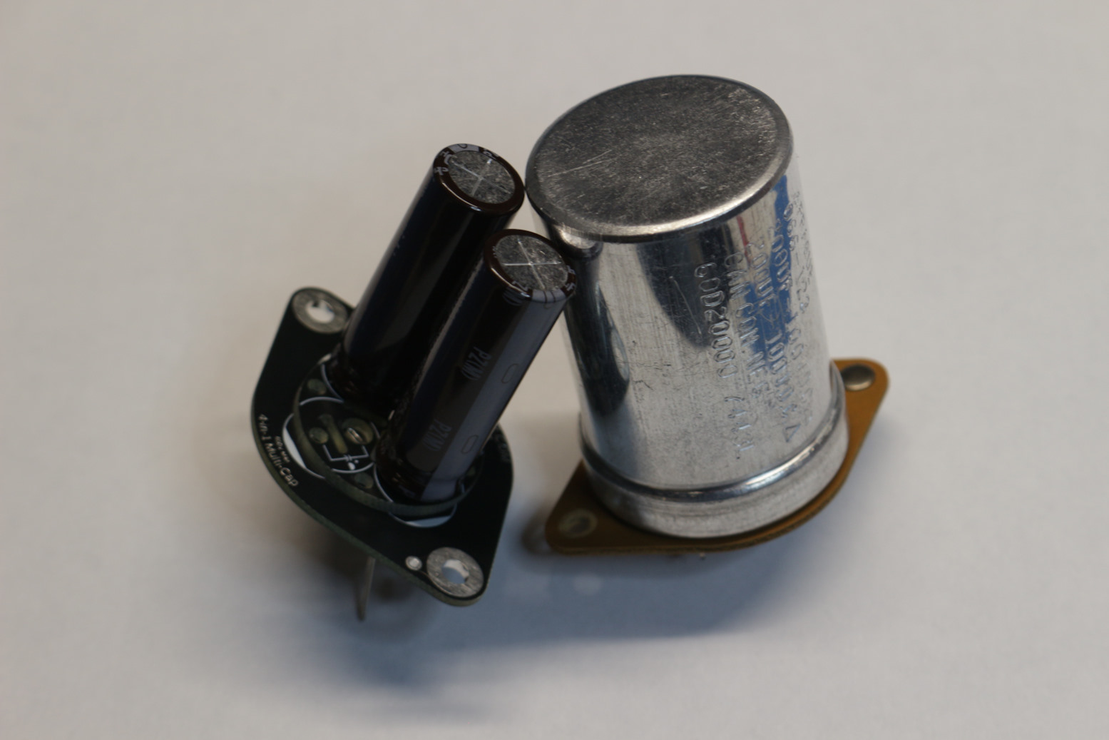This is a replacement kit for the GE multi-section can capacitors used inside the McIntosh MC2100, MC2105, and MC2300 power amplifiers. These cans were stamped with McIntosh part number 066-095. Other models may also use this can. High quality, genuine Nichicon capacitors rated for operation up to 105°C are used to ensure a long operational lifespan, and a custom PCB with thick 2 oz. copper provides a robust and elegant mounting solution. Four wiring turrets facilitate the connections to each of the four caps. No more gutting the old cans and sticking new caps inside!
